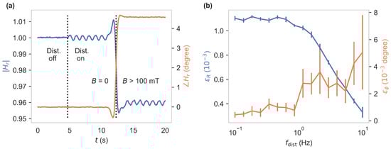 (a) Measurement quantities and at (4th order, low-pass demodulator). The excitation disturbance modulation with frequency was switched on at . For comparison to the magnetic contrasts of both quantities, a magnetic field of > has been applied at . (b) Root-mean-square values of the AC components of magnitude and phase at the disturbance frequency in a range of 0.1–10. Here, a bias magnetic field corresponding to half of the magnetic contrast was applied.