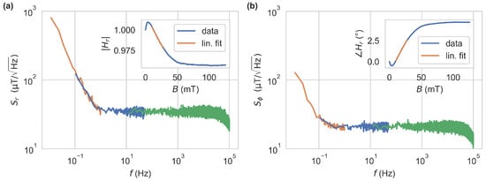 Noise spectral densities based on magnitude (a) and phase (b). The excitation frequency was set to , and a bias field of was applied. Data were recorded by the LIA with the low-pass filter set to fourth order at corner frequencies of , and , corresponding to the green, blue and orange traces. They have been subsequently converted to magnetic field values using the linear fits drawn in the respective insets and converted to spectral densities by Welch’s method.