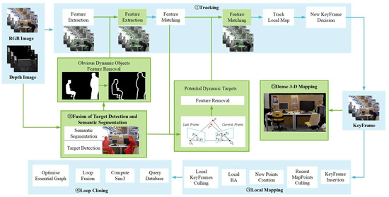 In visual SLAM, the main sensor is a camera. Common types of cameras include monocular, stereo, and red/green/blue–depth (RGB-D) cameras. As visual SLAM has developed [7], the localisation and mapping technology for certain scenes has matured. Moreover, many excellent visual SLAM systems have been proposed, including orientated FAST and rotated BRIEF (ORB)-SLAM1-3 [8,9,10], visual-inertial system (VINS)-Mono [11], large-scale direct (LSD)-SLAM [12], directed sparse odometry (DSO) [13], and parallel tracking and mapping (PTAM) [14]. However, although existing visual SLAM systems have achieved excellent performance for certain scenes, some problems remain to be solved. For example, most visual SLAM algorithms rely heavily on the environment being static, where changes in the field of view mainly arise from the motion of the camera, and there is a lack of other dynamic objects in the environment. However, dynamic objects are indispensable in real environments, and their presence can cause erroneous data associations in the feature point matching process, which affects the localization and map-construction accuracy.