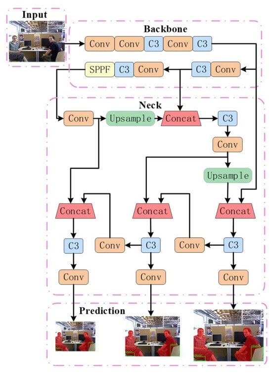 Traditional semantic visual SLAM systems face significant challenges in balancing the accuracy and real-time performance of semantic segmentation networks. Although Mask-RCNN, a common two-stage instance segmentation method, has high segmentation accuracy, it requires relatively long processing times, which makes it difficult to satisfy real-time requirements. Furthermore, some convolutional neural networks, such as fully convolutional networks (FCNs) [36] and SegNet [37] algorithms using encoder–decoder structures, have been extensively employed in visual SLAM systems. However, these approaches do not provide sufficient contextual information and only use single-scale feature maps for segmentation. Consequently, they multiscale feature fusion, which makes it difficult to accurately segment dynamic objects of different scales. To improve the accuracy and operational efficiency of the visual SLAM system, this study adopts the lightweight detection algorithm YOLOv5, and its network structure is shown in Figure 2. Among the YOLO series of algorithms, although YOLOv8 brings many innovations as an updated detection algorithm, its maturity still needs to be improved compared to other versions. Therefore, in order to ensure the stability and reliability of the detection results, this paper decides to adopt the more mature and widely verified YOLOv5 algorithm to provide the a priori information. The structure diagram is mainly divided into four modules, which are the input side of the network; the backbone network, which performs feature extraction on the input image; the neck network, which performs feature fusion on the features extracted by the backbone network; and the head output side. which has three detection heads to predict the feature map. When each frame is passed from the input to the network, the detected image can be output at the output according to the dynamic categories set in this paper. Compared to the Mask-RCNN algorithm, the YOLOv5 segmentation algorithm has a higher operational efficiency, and its design emphasises real-time performance. By integrating the target detection and segmentation tasks into a single stage, the processing speed is significantly improved. Therefore, the SEG-SLAM algorithm can satisfy the requirements for both accuracy and real-time performance.