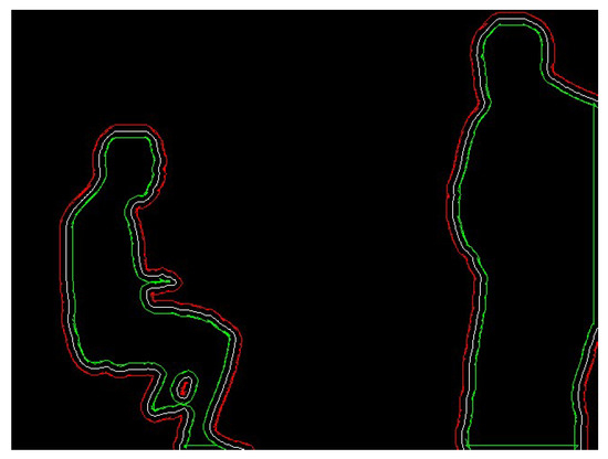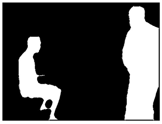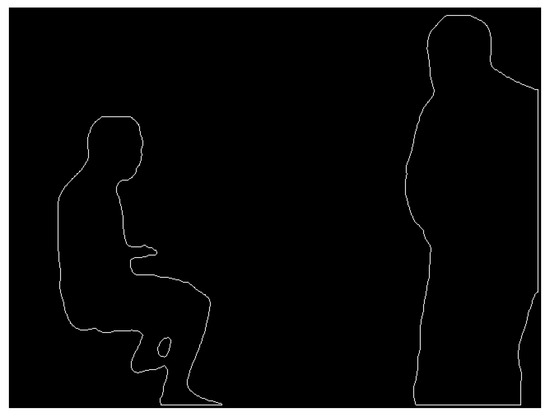 The mask information for obviously dynamic objects is obtained according to the process described in Section 3.2. It consists of a binary image with pixel values of 0 or 255, as shown in Figure 4. To calculate the scaled mask region, the findContours function in the OpenCV library is used to extract the original mask contours. The contours are shown in Figure 5. The contours consist of a finite number of connected points. Therefore, we scale the pixel coordinates of these points and then use the drawContours function to draw a new binary image based on the new coordinates. The traditional coordinate scaling method calculates the relationship between the coordinate points and the centroid of the region and then scales the coordinate points along the centroid direction. However, this method has high requirements for the shape of the contour and complex shapes are difficult to process accurately. Therefore, this study presents a new approach that can be used to calculate various complex contours.