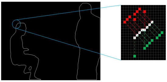 The translation point sets for the original contour in the inward and outward directions are calculated and the calculation schematic is shown in Figure 6. Subsequently, a screening strategy is used to determine which points should be included in the reduced and expanded contours. First, considering the position of the origin of the image pixel coordinate system and the principle of the findContours function, the point farthest from the origin in the first group of calculated points for each contour is added to the reducePoints point set and the other point is added to the expandPoints point set. Second, for each original contour from the 2nd to the nth point, the distances of the two calculated coordinates from the origin are compared to those of the latest coordinates in the reducePoints point set. The point with the smallest distance is added to the reducePoints point set and the other point is added to the expandPoints point set. The results are shown in Figure 7a. This strategy produces an approximate point set. However, the coordinates generated by the findContours function are all integers, which indicates that the point set is not accurate enough, particularly for the left leg of the figure.
