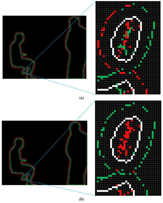 Mask contour optimisation process. The white, red, and green pixels represent the original, enlarged, and reduced contour point sets. (a) Process I; (b) Process II.
