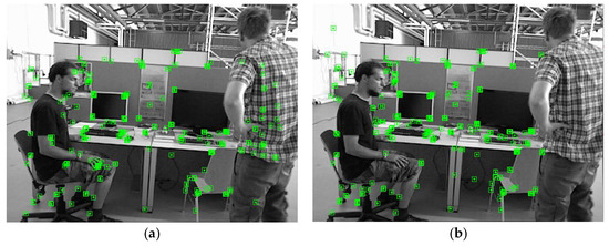Effect of internal mask point rejection. The green points in the diagram are feature points. Points (a) before and (b) after rejection.