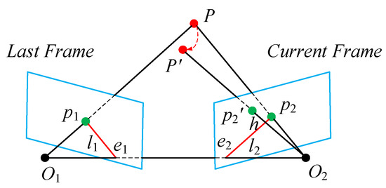 When the surrounding environment remains static, the matching points between two frames satisfy an epipolar geometric relationship. As shown in Figure 13, point is a point in 3D space, and points and represent the camera position in frames 1 and 2, respectively. In addition, points and are the epipoles, lines and are the epipolar lines, and points and are the feature matching points in frames 1 and 2, respectively. Assume that the corresponding matching points between the previous frame feature points and the current frame feature points are
