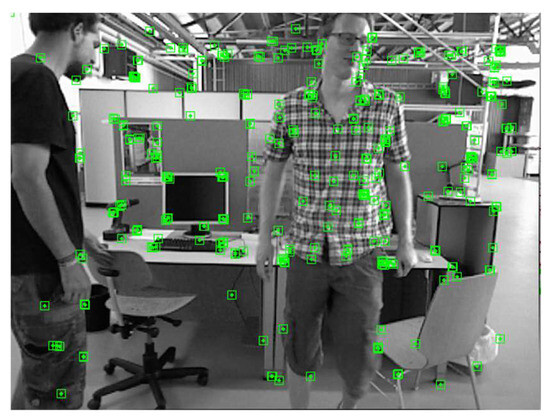 People can adopt different poses, and the depth values of different body parts can vary significantly. Therefore, for each feature point in the mask edge region, the inner feature point on the nearest straight line is selected. For the outer contour, the point in the reducePoints point set on the nearest straight line to the feature point is located. Then, its depth value is compared to that of the feature point to determine whether the point belongs to an obviously dynamic object, such as a person, or the background based on the threshold value. For the inner contour, the point in the expandPoints point set on the nearest straight line to the feature point is located. Then, the depth value is assessed. After debugging, the best effect is achieved when the threshold is set to 0.3 m. That is, when the difference between the depth of the feature point and the depth of the corresponding point is less than 0.3 m, the feature point is rejected; otherwise, it is retained. The rejection effect is shown in Figure 12.