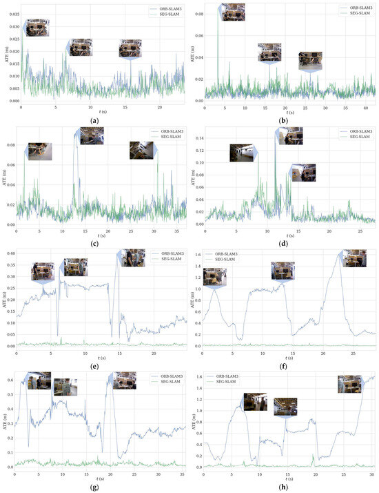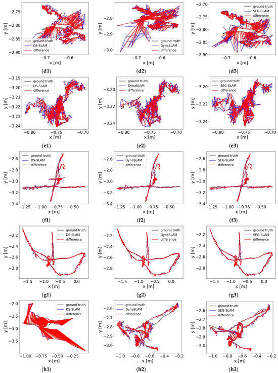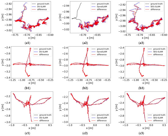 The experimental scene consisted of an indoor office area where humans were the main moving objects. The mobile robot travelled along a circular route. As shown in Figure 21, two perspectives were used to compare the results of ORB-SLAM3 and SEG-SLAM. ORB-SLAM3 failed to eliminate dynamic object feature points, whereas SEG-SLAM eliminated feature points effectively and did not mistakenly eliminate static background feature points. Figure 22 shows a comparison of the trajectories obtained via ORB-SLAM3, DS-SLAM, and SEG-SLAM. SEG-SLAM had the best trajectory effect, whereas ORB-SLAM3 caused serious trajectory drifting owing to erroneous data associations between matching points caused by the retained dynamic feature points. The trajectories obtained using DS-SLAM and SEG-SLAM showed similar trajectories. However, DS-SLAM showed local drifting. Owing to the unstable structure of the lifting platform, the camera shook as the robot moved, which resulted in local trajectory jitters.