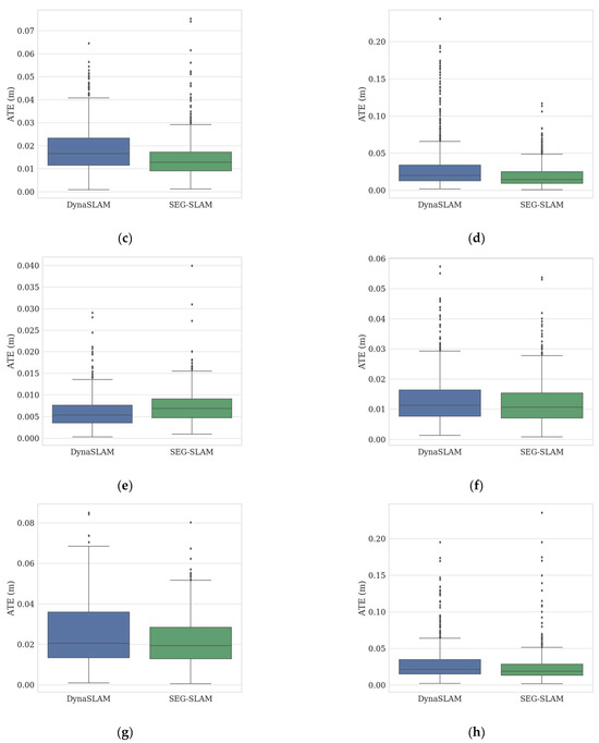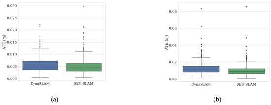 To evaluate the reliability of the system, the performance of the SEG-SLAM system was compared to various mainstream dynamic visual SLAM systems using the TUM dataset and real scenes. The experimental results are presented in Table 2, Table 3, Table 4, Table 5 and Table 6. The positioning accuracy of SEG-SLAM was higher than that of ORB-SLAM3 for highly dynamic sequences and higher than or similar to that of ORB-SLAM3 for slightly dynamic sequences. The ATE values of the two algorithms were compared graphically, as shown in Figure 16. SEG-SLAM was also compared to the state-of-the-art DynaSLAM system, which uses the Mask-RCNN semantic segmentation method. SEG-SLAM showed better overall positioning accuracy and real-time performance than DynaSLAM. The differences between the results obtained using the two algorithms were compared using box plots, as shown in Figure 17. SEG-SLAM used a target detection and semantic segmentation fusion module based on YOLOv5, which had a higher positioning accuracy than other mainstream algorithms based on SegNet, Mask-RCNN, and YOLOv3 target detection. In real scenarios, this paper’s algorithm has higher accuracy compared to ORB-SLAM3 and DS-SLAM algorithms. In terms of real-time, the algorithm in this paper has higher real-time compared to DynaSLAM, DS-SLAM, and other SLAM systems using semantic segmentation algorithms.
