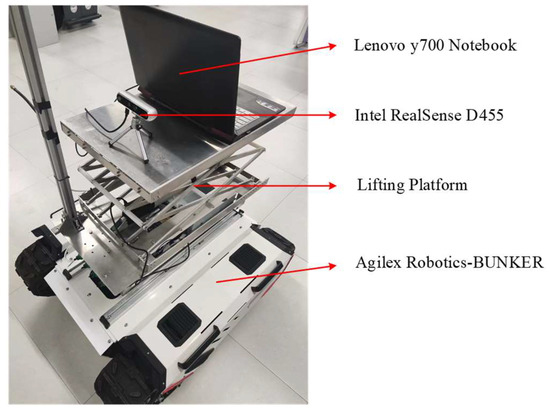 The robustness of the SEG-SLAM system with real scenes was verified using the experimental platform shown in Figure 20. A Lenovo y700 laptop (Lenovo, Beijing, China) and Intel RealSense D455 depth camera (Intel, Santa Clara, CA, USA) were positioned on the lifting platform of an Agilex Robotics-BUNKER mobile platform (AgileX Robotics, Shenzhen, China).