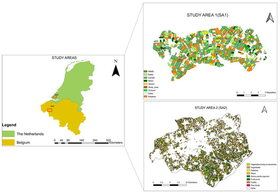 The area is located in the Flanders Region in the western part of Belgium, along the River Leie (Lys) and the Leie–Scheldt Canal. It is one of the important agricultural areas in the country and contains many farming households. The agriculture parcels in Kortrijk are much smaller than those from Noord Beveland. To implement the proposed method, we used the existing datasets on the cultivated crops in the two selected study areas. A total of 54 crop classes for SA1 and 13 crop classes for SA2 were available. However, we reduced the classes to seven crops for SA1 and eight crop classes for SA2, omitting the classes with less than five parcels. For SA1, the crop data were obtained from the Base Registration Crop Parcels agency in the Netherlands (www.PDOK.nl (accessed on 21 March 2024)), and the parcel boundaries from the Agricultural Area of the Netherlands (AAN). The 1584 parcels available in the investigated study area represent arable land, grassland, natural area, and fallow land. Our research focused solely on the 951 crop parcels and seven crop types: cereals; potatoes; beets; onions; orchard; maize; and alfalfa (Table 1). The remaining land use/land cover classes were grouped into ‘water’ and ‘other’. For SA2, the crop data were acquired from the Flemish geoportal Geopunt (www.geopunt.be (accessed on 21 March 2024)). The data consist of agricultural parcels associated with cultivated crops. Eight crop classes were used for the research: maize; grains, seeds, and legumes; potatoes; vegetables, herbs, and ornamental plants; sugar beets; fodder; flax and hemp; and fruits and nuts (Table 2). An additional class of ‘other’ areas was added incorporating the remaining land use and land cover classes available in the study area.