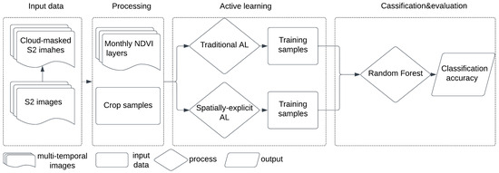 The main methodological steps include (i) image processing; (ii) sample generation for SA1 and SA2. (Note that for our study, we used the existing crop-type database to label the samples selected through AL. In the regions where these data are missing, the users need to label the data through field campaigns.); (iii) AL-based training sample selection considering the spectral domain only; (iv) development of a spatially explicit AL strategy using a semi-variogram; (v) crop type classification, first using a larger number of training samples, then using only samples identified as being relevant by spectral-based AL and, finally, using only training samples generated by spatially explicit AL, and (vi) evaluation of the obtained results (Figure 2).