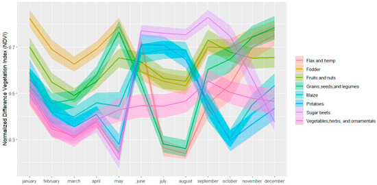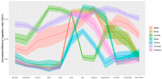 Reducing the size of the labeled set makes it more difficult to distinguish the subtle differences between spectrally similar classes. Several classes in SA1 and SA2 showed high inter-class similarities (Figure 3 and Figure 4). For example, in SA1, the NDVI time-series-based crop growth patterns are similar between maize and potatoes. In contrast to these classes, alfalfa, cereals, and orchard show distinct temporal behaviors. In SA2, maize and potatoes also have similar crop growth patterns (see Figure 4) which makes them challenging to distinguish. Previous studies have also highlighted the difficulties of successfully distinguishing crop types with high inter-class similarities like maize and potatoes [13,14]. Sugar beets or ‘grain, seeds, and legumes’, on the other hand, have a more distinct growth pattern and consequently, there is less overlap with the other crops and less confusion and misclassification.