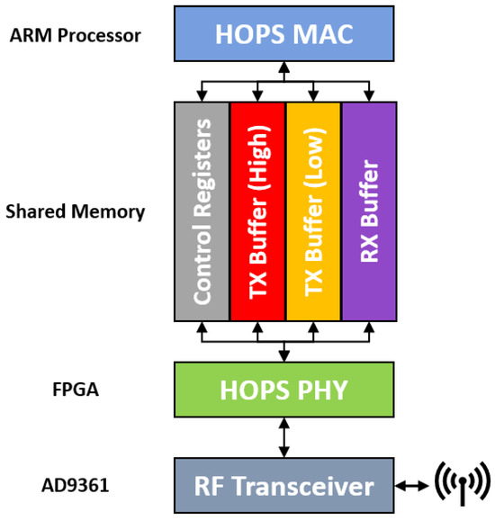 The most common mechanism in wired TSN frameworks to ensure minimum latency for priority traffic is to implement two or more priority queues that are managed for port congestion [41]. For our hardware prototype, we implemented a two-level priority scheme within each wireless node. This priority scheme relies on coordination between our custom MAC software, which runs on the ARM processor as a C executable, and the HOPS PHY, which runs on the field-programmable gate array (FPGA) fabric. These two components communicate through a custom memory-mapped register interface where both the MAC and PHY can access control registers as well as circular buffers designated for transmit and receive data. The transmit buffer is separated into two partitions: one for high-priority outgoing traffic and the other for low priority. In order for both components to track the contents of each buffer, a set of pointer indices is maintained and updated by its respective component when a read or write operation is performed. For example, if the MAC writes a frame to be transmitted to the high-priority transmit buffer, it will subsequently increment variable TXMAC-HIGH. In the next cycle, the FPGA will compare TXMAC-HIGH to TXPHY-HIGH and see that the MAC layer has sent a new frame for transmission. The FPGA logic will always check the high-priority transmit buffer before anything else to ensure the timely delivery of critical messages. The same pointer logic applies to the low-priority transmit buffer and the receive buffer. Figure 2 provides a high-level system diagram showing the components described above.
