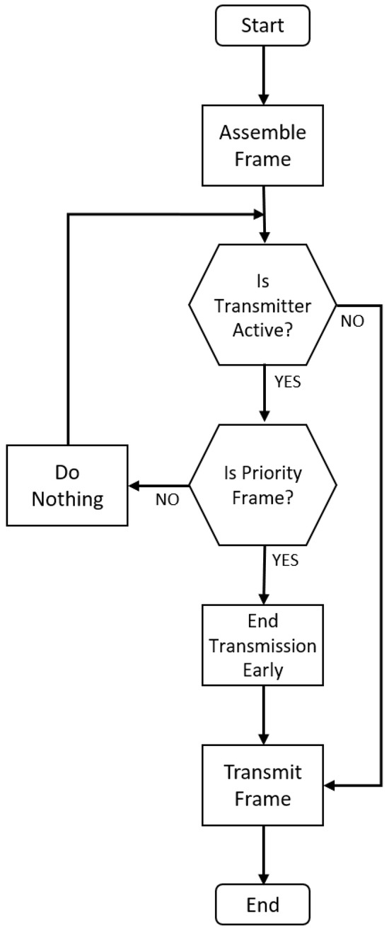 Each individual message within the HOPS device is assigned a priority value within the MAC header. These MAC-layer message definitions include custom allocations to support short, medium, and long variations in both C&C and user data traffic. The multi-tier priority hierarchy eases development by ensuring that messages marked as high-priority get sent to the appropriate buffer automatically. Since the FPGA always checks the high-priority transmit buffer first, critical messages are always transmitted immediately (beginning at the next clock cycle) regardless of what operations are occurring in the background. This alleviates some processing duties at the receiver, which simply processes frames in the order that they are received while ensuring priority tags are maintained. A visual representation of this priority frame processing is shown in Figure 3. The primary difference between the presented message processing flow and others presented in the literature is the unique ability to terminate an outgoing low-priority message in favor of sending a high-priority one. Due to the nature of RA-CDMA, the terminated message may be instantly re-scheduled to be sent at the conclusion of the high-priority transmission. As such, the exact structure of the queuing is not the subject of this figure, since that is highly application-dependent, and may feature more than two queues.