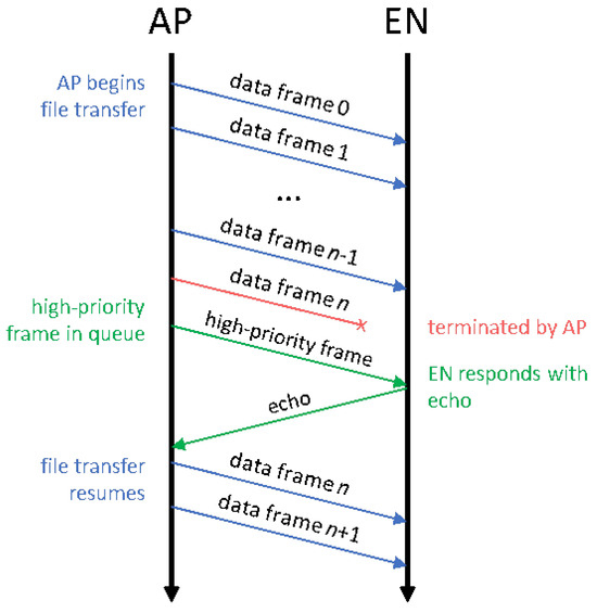 Next, there is a category of messages that may or may not be considered critical based on the target application. The collection of health and status data from the AP to create a network aggregate may be considered critical if the ENs are operating in a harsh environment where part failure is common, allowing the AP to quickly react when an EN is not operating optimally. In more stable environments, this may not be considered critical. Lastly, we generally believe that the transfer of bulk data (e.g., files) should be treated as a low-priority process. A transfer of a 100 KB file using the ‘Data (medium)’ message type would take around 11 s to complete, but we want high-priority traffic to have the opportunity to flow freely and not wait the full 11 s for the file transfer to complete. A capability to terminate any outgoing low-priority frame is necessary to ensure the timely delivery of critical high-priority messages. Given that , the high-priority message is immediately sent out over the wireless link; this is a major benefit of the RA-CDMA network construction. While the strong message correction ability of polar codes may allow a terminated message to be recovered at the receiver, more than likely, the sender will simply re-attempt transmission as soon as the high-priority frames have been delivered. Figure 4 shows a sample protocol diagram for the discussed scenario.