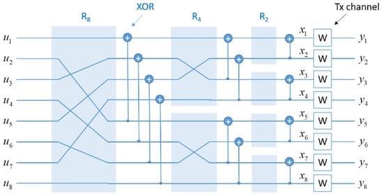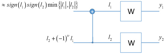Decoding polar codes involves traversing an inverted structure compared to the encoder (see Figure 6). The current approach favors the computationally efficient successive cancellation decoder (SCD) [42,44]. The decoding process begins with observations and, for a binary AWGN channel, the log-likelihood ratio (LLR) is calculated as . LLRs are employed to limit the dynamic range and symmetrically center the decision statistic around zero. The LLR at XOR nodes is approximated as , a computationally efficient and accurate term. At the decision point, if the LLR is positive, the decoded bit is zero, and vice versa. SCD decodes bits successively from lowest to highest index. Notably, the LLR expression at channel inputs is linear in observed output values, and a multiplicative factor uniformly affects LLR values throughout the structure. This property is advantageous for hardware implementation, allowing for the scaling of LLRs in a stage without impacting bit decisions.