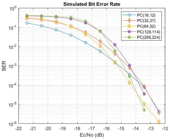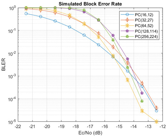 To give an idea of the expected performance for the polar-code-based SCD, simulations were performed in MATLAB R2020b using codeword blocks constructed according to the message types defined in Table 2. The frozen bit indices were determined as discussed before and correspond to the {4,5,12,14,32} indices with the lowest capacities. Figure 7 and Figure 8 show the performance for the HOPS simulated channel in terms of the bit error rate (BER) and block error rate (BLER), respectively, taken according to the energy per chip relative to the noise power spectral density (PSD). Simulations for each message type were run until blocks were evaluated for error. Note that there were no errors per 1 × 106 blocks for values above −12 dB, so the x-axis is stopped there. Also note from Figure 8 that the smallest block size (code rate ) passes the reliability metric of (alternatively, ) at a lower SNR when compared to the other message types, reflecting that fewer of the poorer capacity bit channels are used. However, it is very encouraging to see that all message types are expected to be reliable for dB.