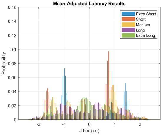 These same results are presented as a boxplot in Figure 9. Of particular note, the progression of increasing latency measurements aligns with what we expected prior to testing (larger message sizes correspond to larger latencies). By achieving one-way transmission of under 1 ms, the practical conclusion is that a reliable TSN extension may be achieved by doubling the prevailing 1 ms latency target of [1] rather than the prevailing methods that generally require order(s) of magnitude increase. Therefore, we contend that extending TSN expectations to include a wireless EN layer is feasible and warranted. Figure 10 offers a closer look at the measured jitter, visualized as a histogram of mean-adjusted one-way latency results. In our design, the jitter can be traced to a mixture of (1) data frame polling and insertion timelines, (2) receiver-side backlog of FEC decoding during high data flows, and (3) clock domain crossings, where the exact timing of when the MAC takes in a new received message depends on the state of the clocks when the message is made available in the buffer.