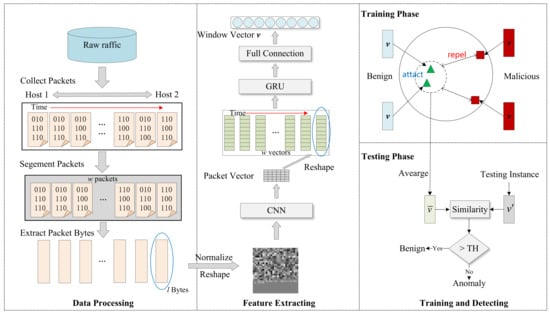 Secondly, the boundary between benign and malicious traffic is becoming increasingly difficult to determine. Attackers are continuously upgrading malware to alter their communication behaviors in order to bypass detection. New attack variants will likely be challenging to detect using previous features, necessitating new feature engineering. Deep learning-based approaches also encounter the issue of adversarial samples. Attackers can treat NIDS as a black-box system and continuously query and adjust the attack traffic features based on feedback until they successfully bypass the NIDS [,]. In order to enhance the capability of IDS to differentiate between benign and malicious traffic, it is crucial to develop models that accentuate the distinction between benign and malicious samples.