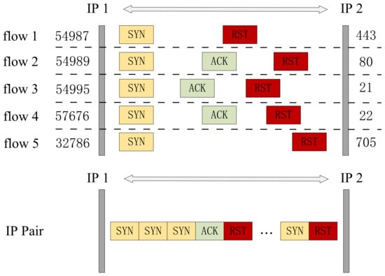Another granularity used in this paper is IP pairs, also known as host pairs. Dainotti et al. [] classified host granularity as the predominant traffic generated by a host, under the assumption that bidirectional traffic to and from the host can be observed. We refine this granularity by using the IP address pairs of both communicating parties as the analysis granularity, where source and destination IPs can be exchanged. Thus, it is more relevant than using one host’s IP as the object of detection. Another advantage is that the granularity of IP pairs contains multiple sessions, which can reflect inter-flow characteristics. Especially for PortScan and DoS attacks, their intra-flow characteristics are closer to normal traffic, but the inter-flow characteristics exhibit clear anomalies.
