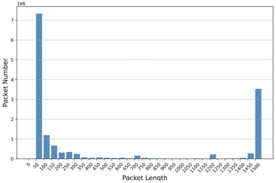 Therefore, our approach takes the first l bytes from the packet, excluding the MAC and IP addresses, as the input for feature learning. If the packet has insufficient bytes, it will be padded with 0 × 00. Finally, we obtain the processed result, denoted as . We sampled approximately 2% of the PCAPs from CSE-CIC-IDS2018 and analyzed the distribution of packet lengths, as illustrated in Figure 3. All the packets are within 1500 bytes, which is the Maximum Transmission Unit (MTU) of Ethernet. The percentage of 1500 bytes is 23.75%. Therefore, we set l as 1480 after removing IP and MAC addresses.
