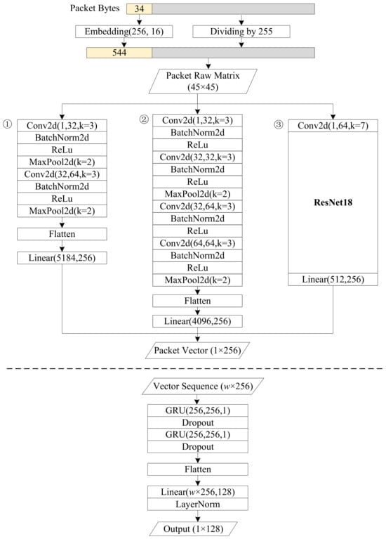 We use 2D-CNN and GRU-based RNN to learn the spatiotemporal representation of . The hierarchical model structure is shown in Figure 4. In this paper, we utilize three CNN models: a basic model with only two convolutional layers, a relatively deeper model with four convolutional layers, and ResNet18, a classic model in the field of computer vision. CNN converts the raw data of a single packet into a vector, and a vector sequence can be formed after all packets in the window have been processed. The sequence is input into the two-layer GRU networks. The output of the entire model is a 128-dimensional vector representing the spatiotemporal features of the packets in the detection window.