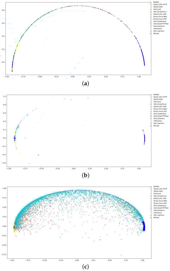 We tested the CHCG with temperature factors of 0.03, 0.05, 0.07, 0.1, 0.15, 0.2, and 0.5 on CSE-CIC-IDS2018. As shown in Table 7, the performance of the model remains relatively stable as increases, indicating that the proposed model has a strong representation capability. However, in the process of experiments, we observed that the distributions of the representations after dimensional reduction exhibit a clear trend. The clusters are sparsest at = 0.03 and become progressively more compact as increases, which is consistent with the findings of the work []. We recommend setting to 0.1 for optimal performance.