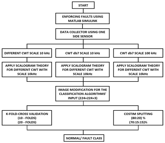 The flowchart in Figure 3 represents the whole process of fault classification using different scenarios for the same methodology.