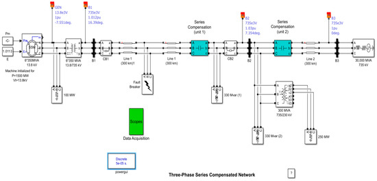 In contrast to research initiatives akin to this study, which predicate their analyses on electrical networks possessing a specific set of fundamental components while omitting critical elements integral to the network’s fault response dynamics, which have been noted in [1,43,44], and introducing a solution, it is evident that such theories, although potentially proficient [21], remain confined in their applicability to a select category of networks. These theories are inherently limited in their generalizability to more complex and scientifically representative network configurations that exist in practical reality. To address this limitation, the present research adopts a network paradigm encompassing an adequate array of fundamental components, mirroring the intricacies of contemporary real-world networks. The MATLAB/Simulink environment is employed for the construction of a transmission network that serves as a simulation platform for a range of fault scenarios. This network encompasses six generating units, each rated at 350 MVA and operating at 13.8 KV, situated at one end. In contrast, the opposing terminal accommodates a single 30,000 MVA generating unit at 735 KV. In the interconnecting transmission network, two non-linear and two linear loads are integrated, forming a complex configuration. Specifically, this network incorporates two reactive loads, each with a capacity of 330 MVAR for the lagging load, along with active loads of 100 MW and 250 MW. The transformer configuration is comprised of six 350 MVA units with a 13.8/735 KV rating, featuring two windings at one end, and a single 300 MVA unit at 735/230 KV with three windings at the other end, as delineated in Figure 4 [24,44].