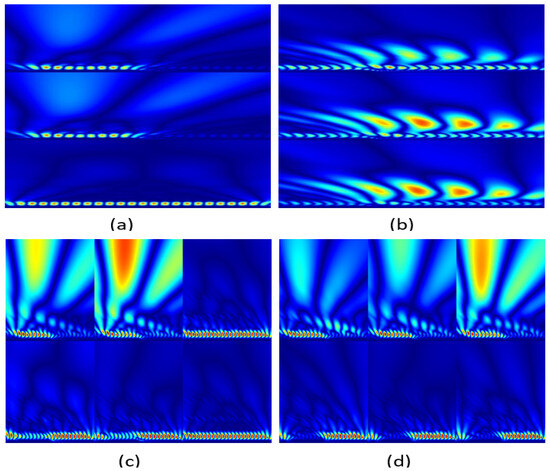 This section delineates the sources from which the dataset was collected or produced, providing insights into the nature of the data collection. The data gathering process involved the utilization of recording equipment situated solely on one side of the network, distinguishing this approach from prior methodologies [45,46]. Two distinct scenarios were devised for data evaluation. In the first scenario, data were exclusively collected for phase currents, encompassing an array of wavelet types and levels, as shown in Figure 5a,b. The second scenario involved the simultaneous collection of phase currents and voltages from the same recorders placed on one side of the network. Subsequently, these data were combined into a unified matrix, undergoing continuous wavelet transformation (CWT) to generate scalogram images. These results are visually represented in Figure 5c,d, demonstrating a row-based structure for the first scenario and a dual-row structure for the second. The top row shows phase currents in scalogram format, while the lower row features phase voltages, as depicted in Figure 5c,d. The derived data were then employed as input for deep learning systems utilizing pretrained models in both conventional and k-fold cross-validation configurations. This automated system effectively accommodated a wide spectrum of fault scenarios, encompassing diverse fault types, locations, time occurrences, and variations in fault resistance values.