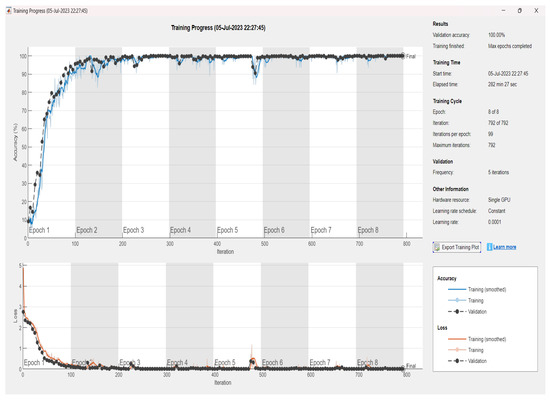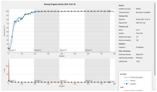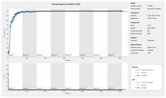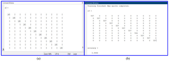 This article will focus on presenting the results obtained using MATLAB, distinct from the myriad results obtained through the use of various other software and tools. Specifically, it will delve into the performance of the convolutional neural network (CNN) model based on the VGG19 and VGG16 architectures. Figure 6, Figure 7 and Figure 8 provide an illustrative representation of the training progress for the proposed pretrained CNN model. Notably, the aforementioned figures showcase a remarkable achievement of 100, 100, and 99.98% accuracy, respectively, during both the validation and training phases. This outstanding accuracy serves as a testament to the effectiveness of the proposed model in successfully classifying images within the given dataset. Furthermore, Figure 9a,b presents a detailed visualization of the confusion matrix generated after the model’s training process. The dataset under consideration comprises a substantial number of files, totaling 61,226 individual images. These images are consciously distributed across 11 distinct classes, encompassing ten different types of faults, in addition to a class denoting the absence of any faults. Notably, each of these 11 classes includes an equal number of 5566 images, which were precisely fed into the training model for comprehensive evaluation. These results underscore the robustness and precision of the proposed CNN model, demonstrating its capability to effectively discern and classify diverse fault types within a sizable and diverse dataset, further solidifying its potential for real-world applications.