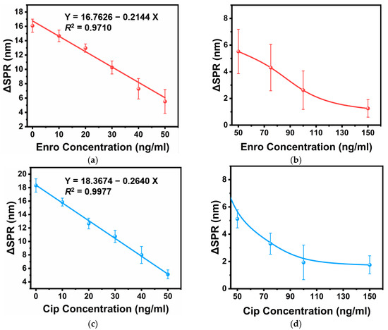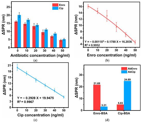 | Enro/Cip | Fiber-optic SPR sensor | 0–50 ng/mL | 0.81 ng/mL (Enro) 1.20 ng/mL (Cip) | 96.46–120.46 (Enro) 96.74–126.9 (Cip) | This study |