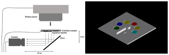 To generate the depth–light curves for each of the six scintillator samples, we designed a detector plate that would ensure that the scintillating glass samples would be in the plane perpendicular to the beam and at the same water-equivalent depth, along with an Advanced Markus ionization chamber (PTW, Freiburg, Germany) for measuring the depth–dose curve (see Figure 1). The experimental plate was manufactured with the Ultimaker S5 extrusion 3D printer (Utrecht, The Netherlands), which has a layer accuracy of 0.2 mm. The detector plate was specifically designed to be mounted on an XRV-2000 Falcon Beam Profiler (Logos Vision Systems, Scotts Valley, CA, USA), which is equipped with a mirror that directs scintillation light from the plate to a built-in CMOS camera. To ensure the accuracy of our measurements by avoiding the contamination of light from other sources, including PMMA scintillation, the scintillator holder plate and camera were enclosed in a light-tight enclosure within the XRV-2000 Falcon Beam Profiler.