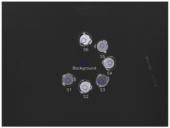 Image of the scintillator samples during irradiation, taken by the CMOS camera at a water-equivalent depth of 132 mm, the position of the Bragg peak. The ROIs used to measure average pixel intensity are outlined in blue.