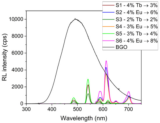 We measured relative luminosity by crushing the scintillator samples to powder and comparing their luminosity to that of bismuth germanium oxide (BGO, 99.9995%, metals basis, Alfa Aesar Puratronic, Thermo Fisher Scientific, Waltham, MA, USA) scintillator powder, which is well characterized in the literature [48,49]. The relative luminosity measurements were made using a custom-designed configuration of the Freiberg Instruments Lexsyg spectrofluorometer (Freiberg, Germany) equipped with a Varian Medical Systems VF-50J X-ray tube (Palo Alto, CA, USA) with a tungsten target, coupled with a Crystal Photonics CXD-S10 photodiode (Berlin, Germany) for continuous radiation intensity monitoring. The light emitted by the sample was collected by an Andor Technology (Belfast, UK) system comprised of a SR-OPT-8024 optical fiber, Shamrock 163 spectrograph, and a cooled (−80 °C) DU920P-BU Newton CCD camera (spectral resolution of ~0.5 nm/pixel). Relative luminosity was measured under continuous X-ray irradiation (W lines and bremsstrahlung radiation; 40 kV, 1 mA) with an integration time of 5 s. The powdered glass samples and BGO powder filled ~8 mm diameter, 0.5 mm deep cups, allowing for comparison of equal volumes and the determination of relative luminosity. The relative luminosity results correspond to the ratio of the spectra integral from 300 to 750 nm using the BGO spectrum integral as reference.