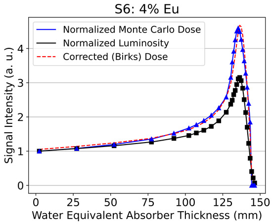 Figure 4 shows the extent of ionization quenching in the relative luminosity (black) of sample 6 compared to the calculated dose (blue). In terms of Birks correction factors, samples with Tb2O3 had higher factors, indicating that ionization quenching might be more significant for scintillators activated with Tb2O3. Figure 4 demonstrates the success of Birks’s equation for correcting ionization quenching for the sample with the highest relative luminosity, S6, which is shown in the dashed red line and very closely matches the calculated dose in blue.