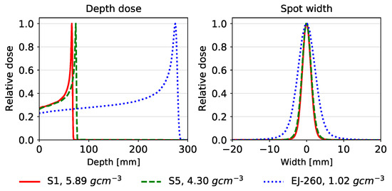 Depth–dose curves of a 200 MeV proton beam in Sample S1 (tungsten and gadolinium oxide glass), sample S5 (lead borate glass), and EJ-260 (organic plastic scintillator) (left). Lateral profiles at the Bragg peak of a 200 MeV proton beam for the three samples (right).