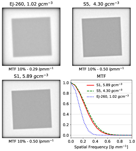 The decreased scatter led, as expected, to increased spatial resolution, as measured by the simulation of beam transport through a tilted Al block in a water phantom (Figure 6). The EJ-260 block yielded a 10% modulation transfer function (MTF10%) of 0.29 line pairs per mm (lp/mm), while the lead oxide and tungsten–gadolinium oxide glass scintillators both yielded an MTF10% of 0.50 lp/mm (Figure 6).