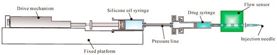 To achieve precise control of drug injection, we developed a liquid-driven injection system. Figure 1 shows the overall schematic diagram of the liquid-driven injection system, which includes the drive mechanism, silicone oil syringe, drug syringe, flow sensor, and pressure pipeline. The drive mechanism is connected to the silicone oil syringe via a mechanical mechanism. The silicone oil syringe is then connected to the drug syringe via a pressure pipeline. The drug syringe is connected to the flow sensor through the drug delivery pipeline. Finally, it is connected to the injection needle.
