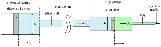 The modeling of the liquid-driven injection system is shown in Figure 2. Due to the transient response of the piston’s rubber, the piston velocity is not strictly equal to the velocity of the fluid. As for the silicone oil syringe, the relationship between the velocity of the silicone oil piston and the velocity of the silicone oil can be considered a first-order system [28]: