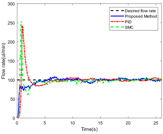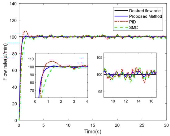 Firstly, we set the desired flow rate of the drug solution to 100 μL/min and controlled the injection system for flow-rate tracking. As shown in Figure 9, the proposed PID-SMC method was compared with the PID controller and SMC controller.