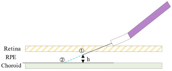 The subscript 1 in Equation (18) refers to the top of the injection needle, corresponding to point ① in Figure 5. The subscript 2 refers to the impacted surface of the choroid, corresponding to point ② in Figure 5.