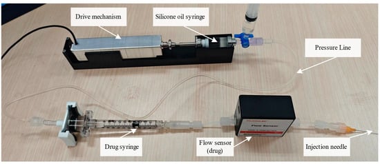 The primary components of the system consist of a micro-linear servo actuator (BLACF30-C112, Inspire-Robots, Beijing, China), the 2.5 mL silicone oil syringe, two flow sensors (SLI-1000, SENSIRION, Stäfa, Switzerland), a pressure pipeline (polyvinyl chloride (PVC) pipe and polytetrafluoroethylene (PTFE) pipe), and the fixed base for the injection device, as shown in Figure 6.