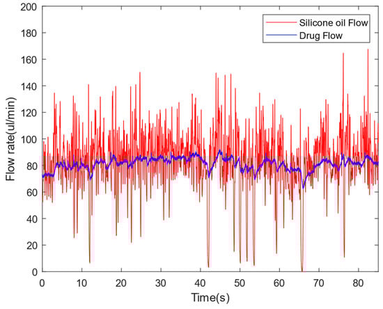 The micro-linear servo-actuator is a small integrated linear servo system that integrates a core-less motor, a precision planetary reducer, a sensor, a precision screw mechanism, and a closed-loop control system. It is used to push the piston of the silicone oil syringe, with a push range of 30 mm and a maximum push–pull force of 120 N. The actuator guarantees the surgical injection volume and provides sufficient push force. Due to the buffering of the piston, the shaking of the drug flow rate can be effectively reduced. As shown in Figure 7, when a constant speed is provided to the electric cylinder in the open-loop state, the flow amplitude of the drug is significantly smaller than that of silicone oil.