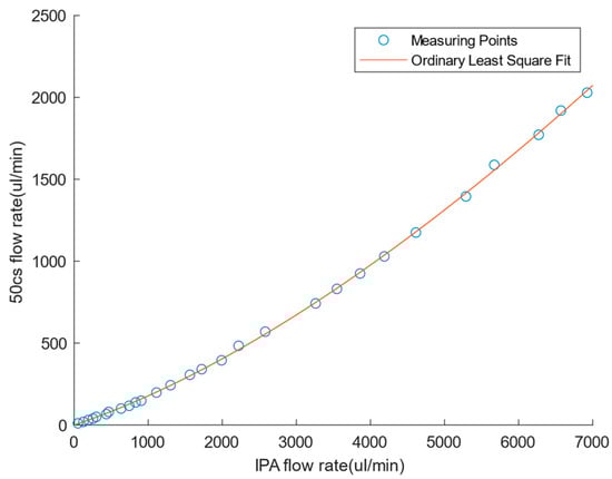 Figure 8 shows the fitted quartic function curve for calibrating the 50c silicone oil flow rate based on the IPA solvent. The method used for fitting was the least square method. The flow rate of silicone oil was calibrated to the range of 0–2000 μL/min. This was sufficient for subsequent flow comparison experiments. Since there was little difference between the density of diluted indocyanine green solution and water in the experiment, the flow sensor standard aqueous solution mode was used directly for drug flow measurement.
