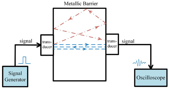 As shown in Figure 1, the ultrasonic transmission channel consisted of a pair of coaxially aligned transducers and a 50 mm thick aluminum plate. The nominal resonance frequency of both transducers was 10 MHz. To obtain a good coupling, a thin layer of couplant gel was added between each one of the transducers and the metal plate. During propagation, ultrasound experiences reflection and refraction at the inner surface of the metal plate, causing the carried signals to reach the receiver through multiple paths. Due to the different lengths of these paths, the signals in the receiver exhibit various delays and attenuations, which further leads to the incorrect superposition of multiple signals. Consequently, signal distortion occurs and the communication performance deteriorates.