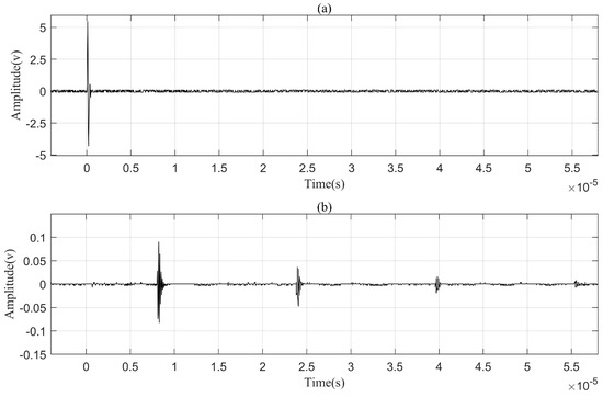 Impulse response of the 50 mm long aluminum channel with a pair of coaxially aligned ultrasonic transducers. (a) signal exerted on the transmitting transducer. (b) signals collected at the receiving transducer.