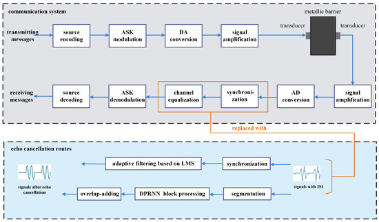 Figure 4 depicts a block diagram of an ultrasonic through-metal communication system assisted with two alternative approaches of echo cancellation. The upper part of this figure is the system architecture similar to a general one, comprised of a signal transmitting side, a 50 mm long metal channel, and a signal receiving side. Signals undergo several processing steps upon entering the transmitting side, including source coding, ASK digital modulation, DA conversion, and signal amplification. Following that, the modulated ultrasound is transmitted into the metal channel via electroacoustic conversion afforded by the transmitting transducer. On the signal receiving side, ultrasonic signals are subjected to the reverse process including acoustoelectric conversion, signal amplification, AD conversion, synchronization, channel equalization, digital demodulation, and source decoding.