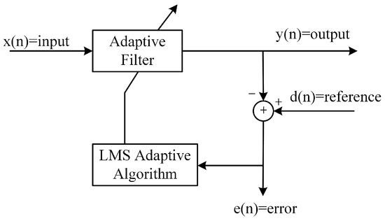 The internal structure of the LMS adaptive filter is shown in Figure 5, and adaptive algorithms are used to update the filter coefficients of the adaptive filter. LMS is a search algorithm in which weight coefficients of a filter are updated on the basis of the steepest descent, moving weight coefficients in proportion to the instantaneous gradient estimate of the mean square error [30]. The formula is as follows: