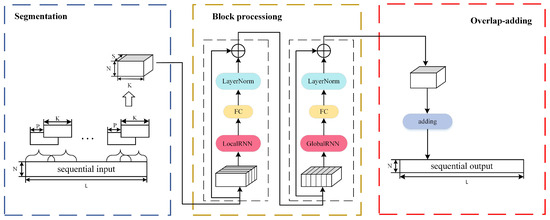 The segmentation operation divides continuous input signals with a feature dimension of N and a time step of L into overlapped blocks of length K and hop size P, where . This performance results in S blocks with equal size, denoted as . Subsequently, all the blocks are concatenated to form a 3D tensor .